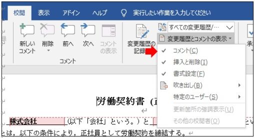 まず,Wordの上部,「校閲」タブから「変更履歴とコメントの表示」を選びます。 次に,「変更履歴とコメントの表示」を押すとプルダウンメニューが表示されますので, 一番上にあるコメントのチェックマークをはずします。 そうしますと,コメントが非表示になります。
